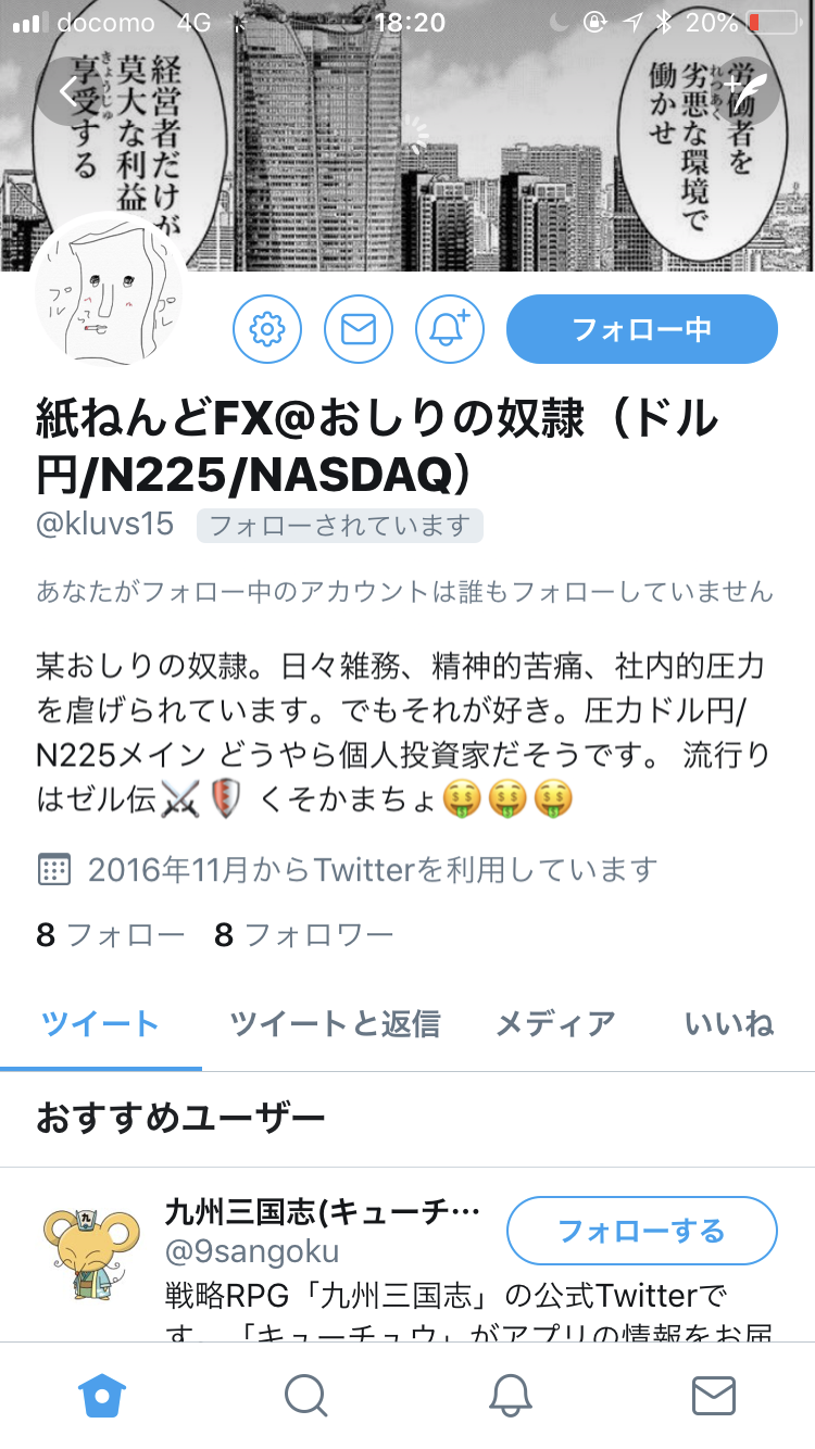 ツイート内容はハナクソみたいな内容がほとんどですが、ごく稀にトレードのちゃんとした分析とかあげるらしいのでフォローの価値有りかと。笑